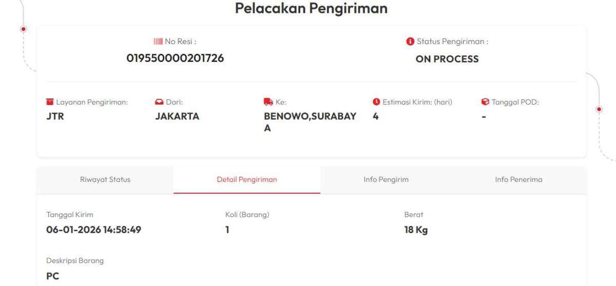 Paket dikirim pada 6 Januari 2026 dari Agen JNE Kalipasir, Jakarta Pusat, menuju Surabaya dengan nomor resi: 019550000201726, estimasi pengiriman 4 hari. Namun hingga hari ini, paket tidak pernah sampai dan dinyatakan tidak terlacak. Isi paket tersebut adalah satu unit PC beserta komponennya, merupakan barang pribadi untuk keperluan pindahan dari Jakarta ke Surabaya. Barang ini memiliki nilai penting karena digunakan untuk kebutuhan kerja sehari-hari dan berisi data pribadi.
