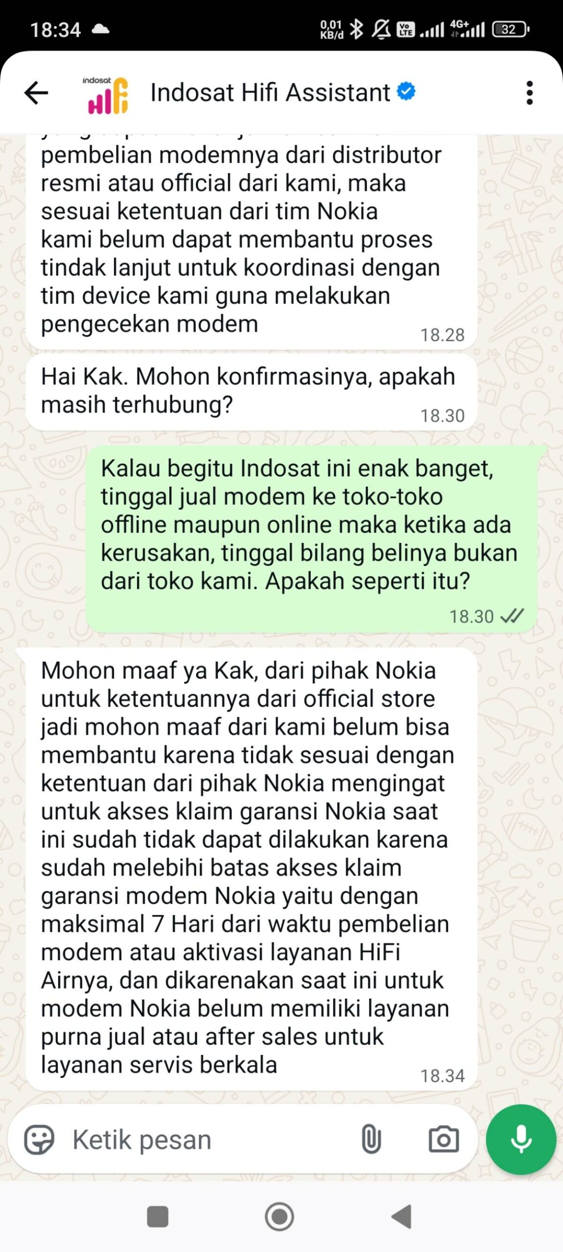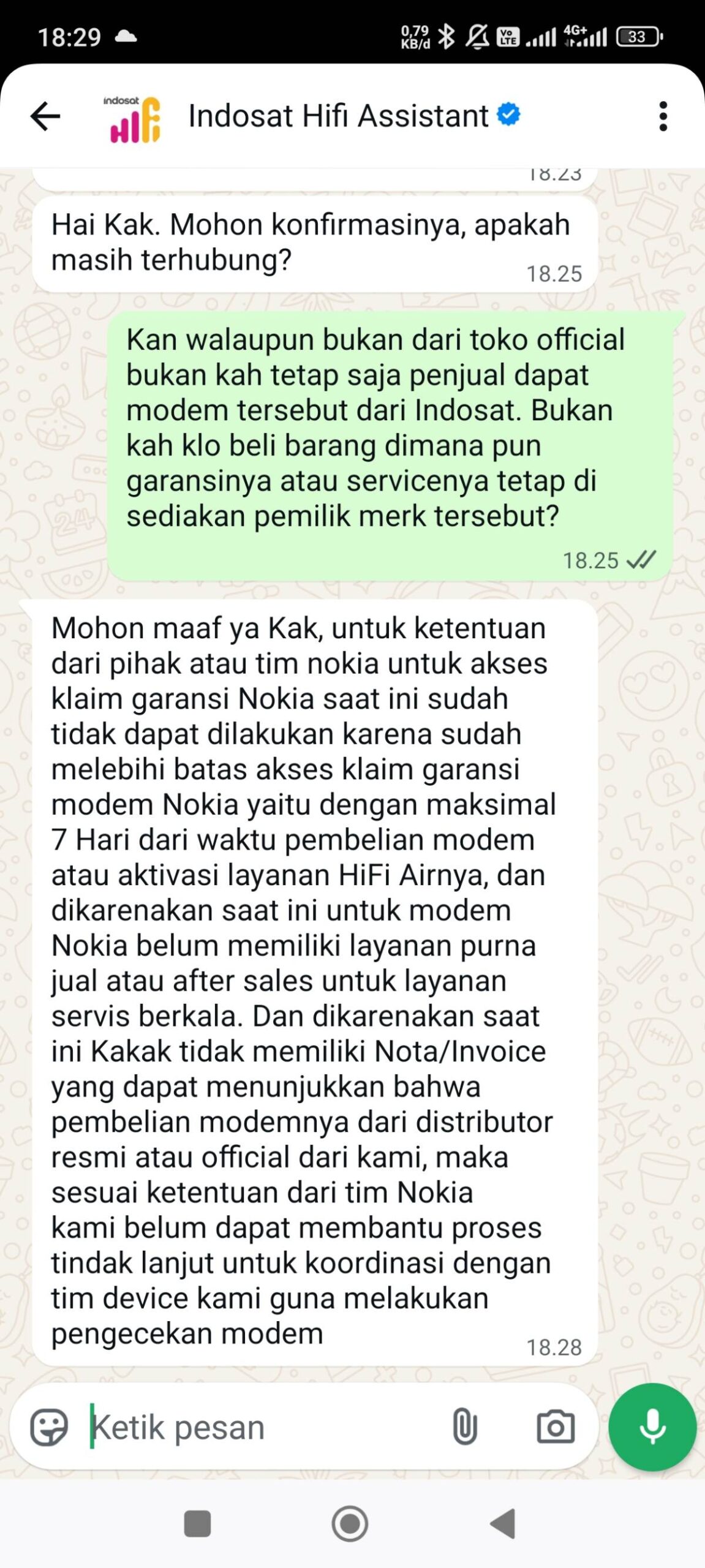 Akhirnya, saya memutuskan menghubungi contact center yang tercantum di modem, tetapi jawabannya sangat mengecewakan. Mereka terkesan lepas tangan dengan alasan saya tidak membeli modem tersebut di official store atau toko resmi. Saya lampirkan jawaban dari contact center Indosat HiFi Air sebagai berikut.