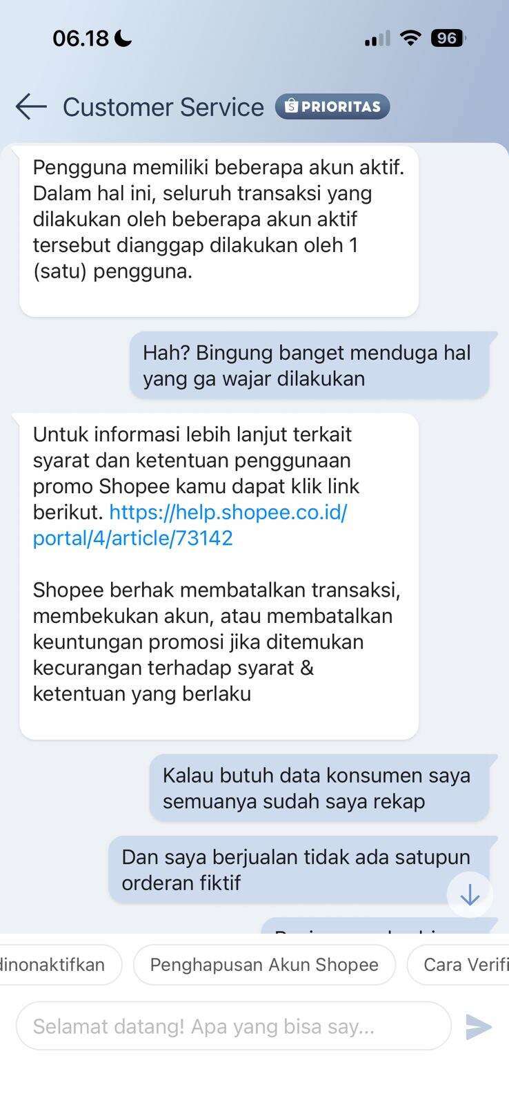 Dan juga seller tidak diberikan ruang untuk membuka data konsumen agar tidak terjadi tuduhan sepihak. Terlalu aneh Shopee melakukan tuduhan tanpa kejelasan sedikit pun terhadap seller yang penjualannya sudah tembus 30–40 juta sebulan.