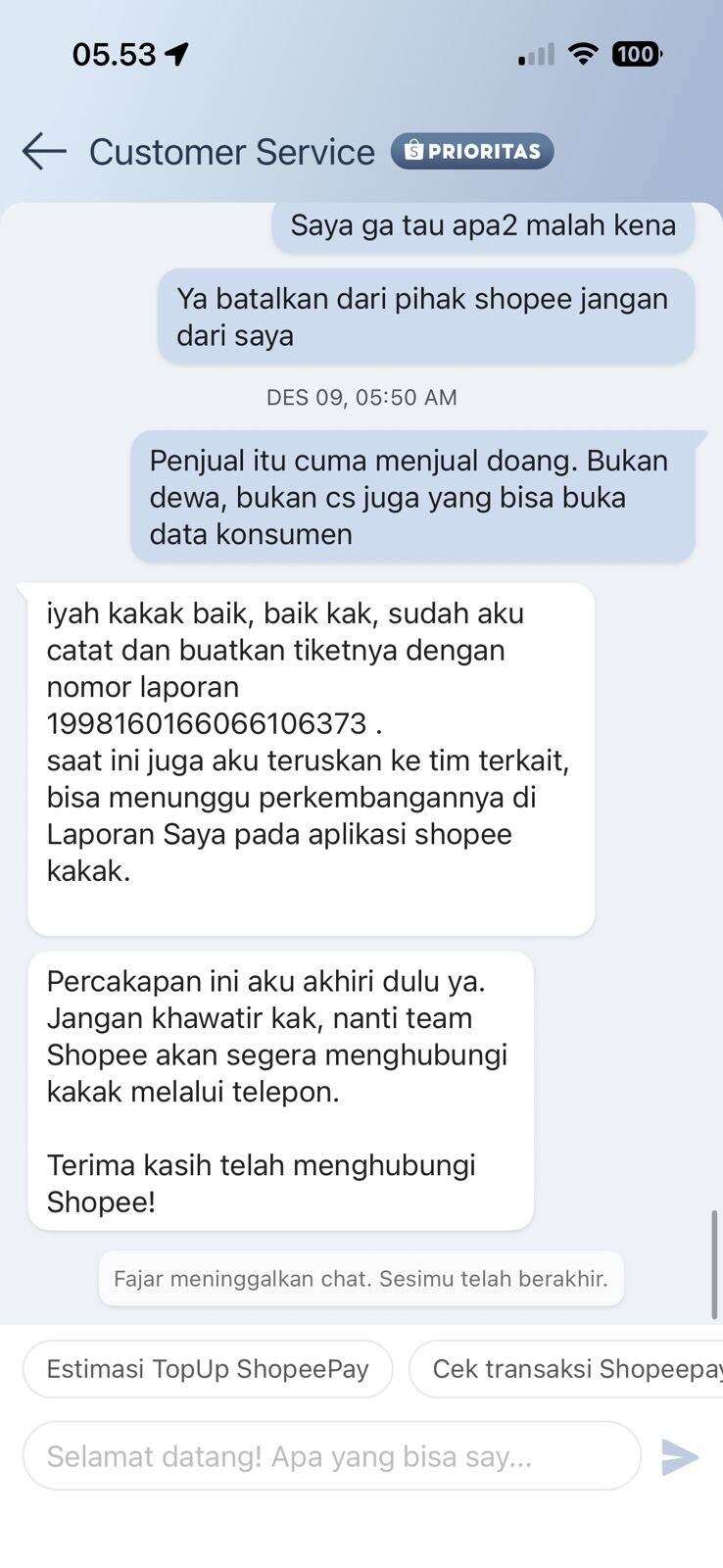 Dan tentu saya sudah melaporkan kejadian tersebut ke pihak Shopee dan jawabannya sudah dijawab 2 kali dengan jawaban template. Serta perlakuan CS Shopee yang tidak bisa menjawab pertanyaan serta terus memutarkan jawaban yang tidak menjawab.