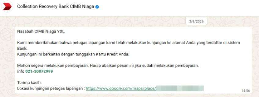 Pada 13 Maret 2026, saya mengetahui dari akun resmi Collection Recovery CIMB bahwa petugas tetap mendatangi rumah saya berulang kali saat saya tidak ada di tempat. Nomor saya selalu aktif, WhatsApp selalu saya balas, dan posisi saya jelas tidak berada di Jakarta. Lalu apa tujuan petugas terus mendatangi rumah? Apakah untuk menekan keluarga dan mempermalukan saya di lingkungan sekitar?