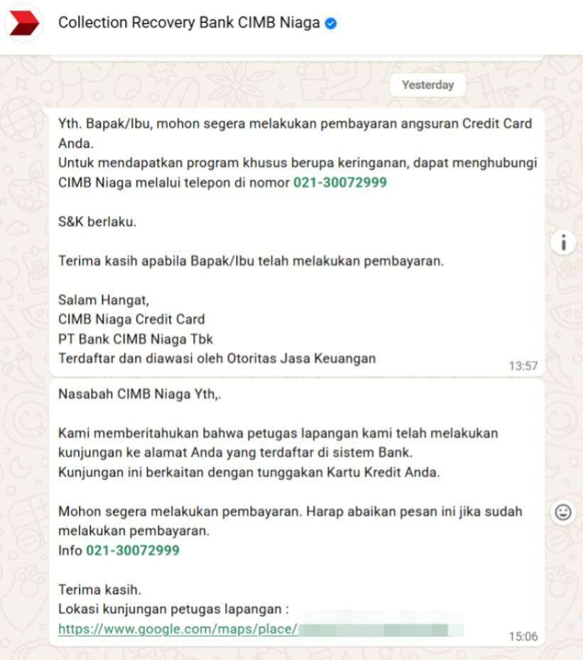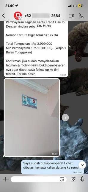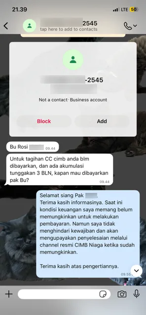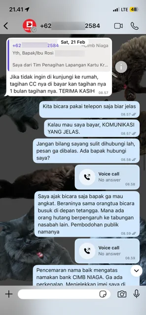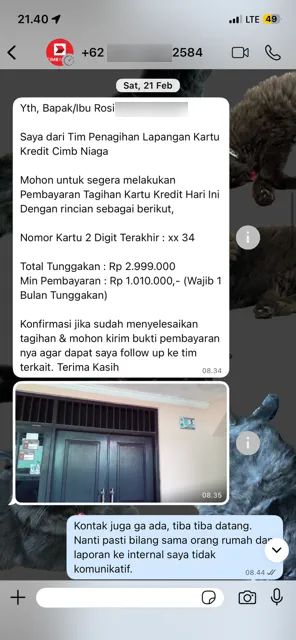 Saya telah merespons pihak yang mengatasnamakan CIMB via WhatsApp. Sebagai bukti nyata bahwa saya tidak lari dari tanggung jawab, saya telah menyampaikan kesanggupan mencicil sebesar Rp250.000. Meskipun angka ini belum mencapai minimum payment, ini adalah jumlah maksimal yang bisa saya alokasikan saat ini di tengah upaya menyelesaikan berbagai kewajiban keuangan lainnya. Saya kooperatif dan tetap berkomunikasi, namun respons yang saya terima justru berupa intimidasi lapangan.