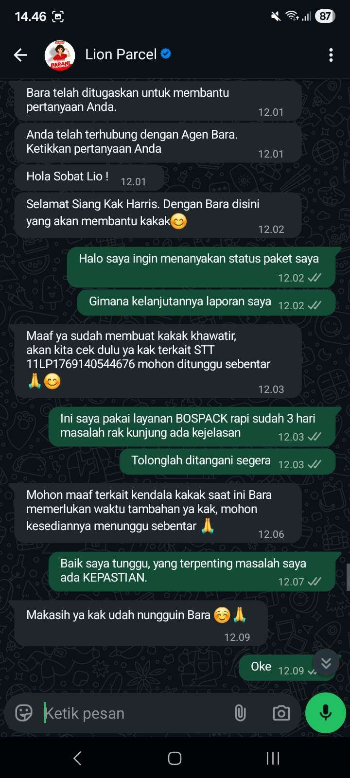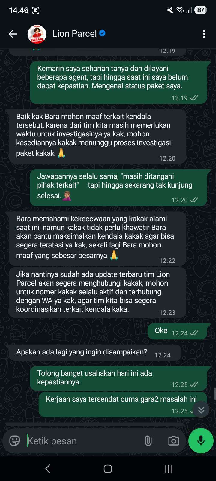 Saya adalah salah satu pengguna layanan pengiriman dengan ekspedisi Lion Parcel. Melalui surat ini, saya ingin menyampaikan keluhan atas pelayanan Lion Parcel yang sangat merugikan dan terlalu lambat saya sebagai customer, dan hingga saat ini tidak ada kejelasan serta tanggung jawab dari pihak terkait.