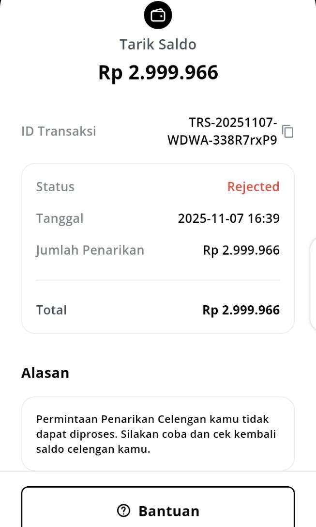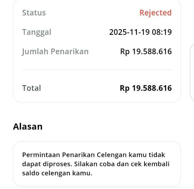 Pada tanggal 19 November 2025, saya melakukan penarikan seluruh saldo yang ada di Treasury dengan nomor transaksi: TRS-20251119-WDWA-66teSq8yW senilai Rp19.588.616. Namun, saldo saya kembali gagal masuk ke rekening dengan alasan “Rejected“.