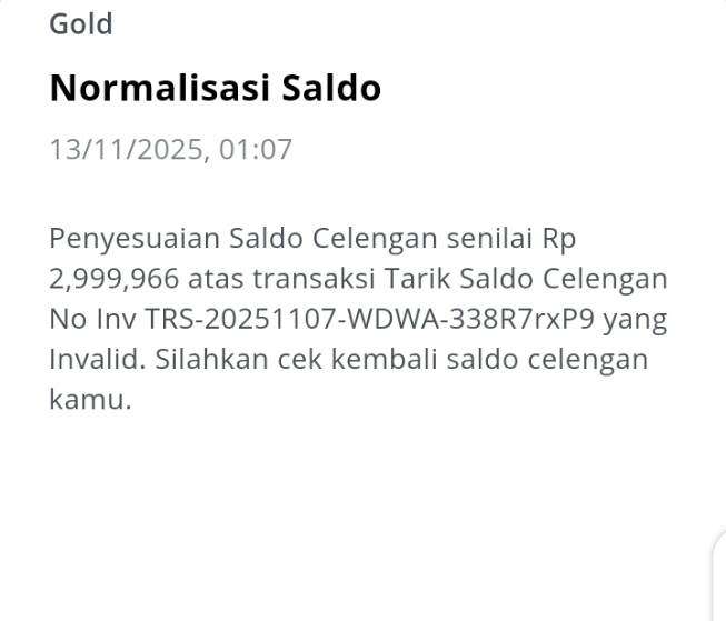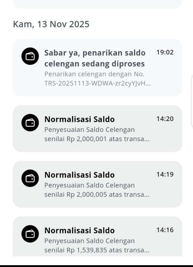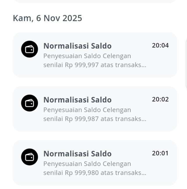 Ketiga saldo dari transaksi tersebut tidak langsung kembali ke celengan, melainkan harus diajukan keluhan ke customer service dan baru bisa diproses dalam waktu 1×24 jam setelah laporan. Saldo kembali ke celengan pada tanggal 06 November 2025 pukul 20:01, 20:02, dan 20:23.
