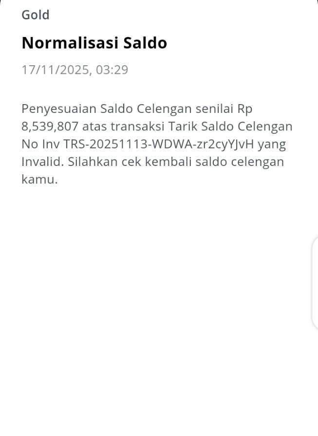 Saldo celengan merupakan dompet saldo Treasury yang digunakan untuk menyimpan uang kita dalam bentuk rupiah, baik untuk top up maupun penarikan saldo sebelum dan sesudah transaksi jual beli emas digital. Ketiga transaksi tersebut dinyatakan “Rejected“, dengan keterangan bahwa permintaan penarikan celengan Anda tidak dapat diproses. Silakan coba dan periksa kembali saldo celengan Anda. Screenshot transaksi terlampir.