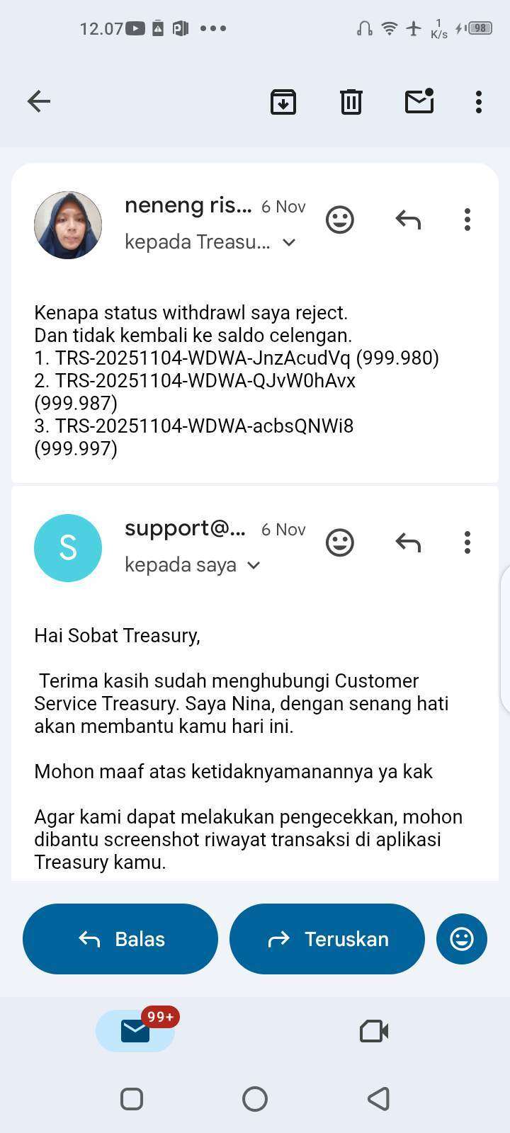 Hingga saat ini, saldo saya belum kembali. Saya sudah merasa lelah bolak-balik mengirim email ke customer service yang tidak memberikan solusi untuk masalah saya. Bagi yang sering bertransaksi di Treasury, saya harap mulai sekarang harus lebih berhati-hati. Semoga apa yang saya alami tidak terjadi lagi di masa depan.