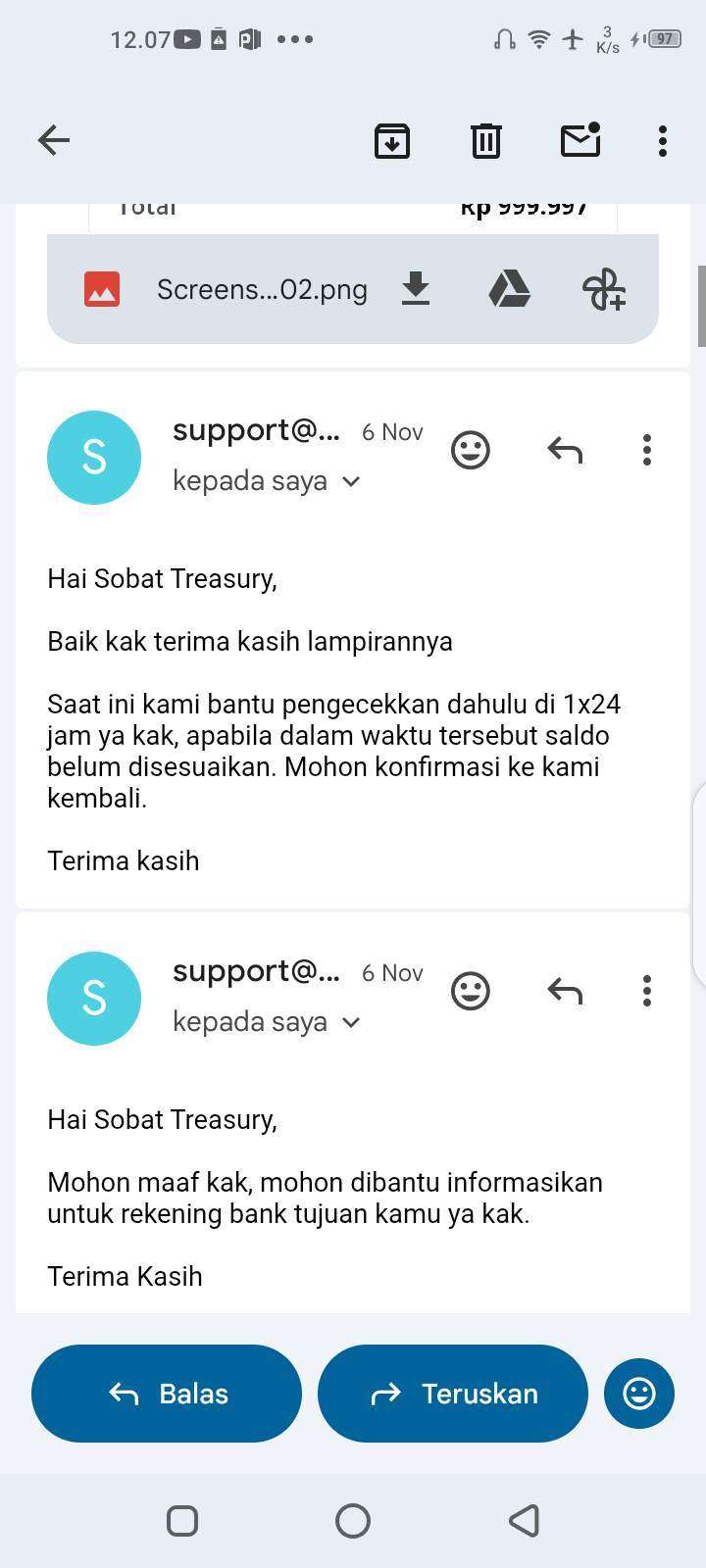 Namun, statusnya kembali “Rejected” dan saldo tidak langsung masuk ke celengan, melainkan harus mengajukan keluhan lagi. Namun dalam keluhan kedua ini, saldo celengan tidak kembali dalam waktu 1×24 jam. Saya harus terus mengirim email kepada pihak Treasury. Saldo kembali pada tanggal 13 November pukul 01:07, yang artinya memerlukan waktu sekitar 6 hari untuk kembali ke saldo.