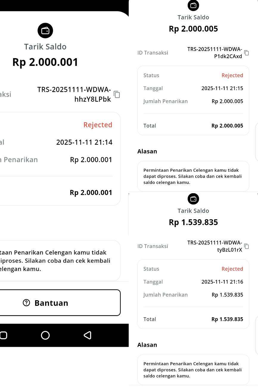 Saya kembali mengajukan keluhan kepada customer service dan saldo saya kembali ke celengan pada tanggal 13 November 2025, bersamaan dengan transaksi yang ditolak sebelumnya. Jadi, total transaksi dengan status ditolak adalah Rp8.539.807.
