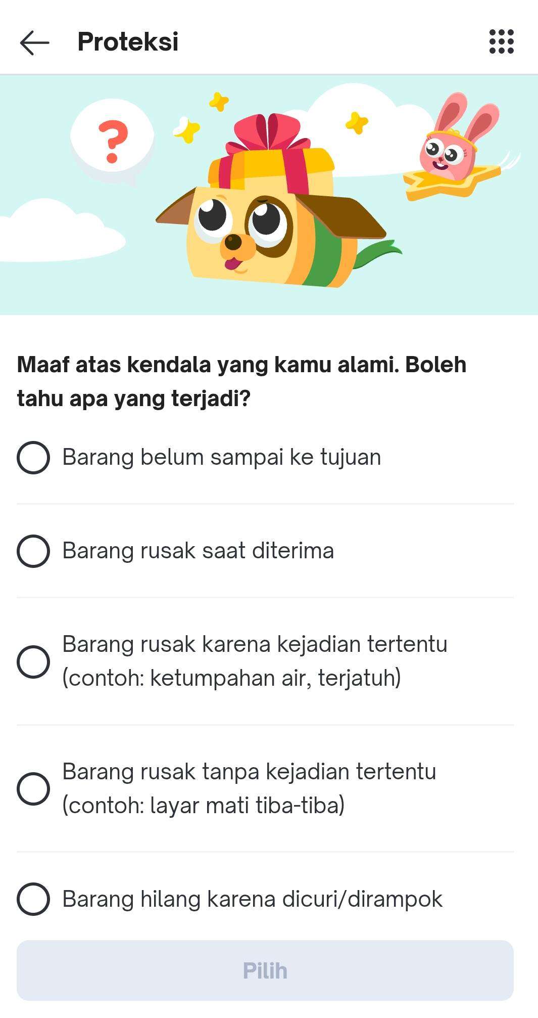 Setelah dipakai sekitar sebulan, benar lampu mati sebelah. Mulailah saya claim polisnya. Pilihan “Barang rusak tanpa kejadian tertentu” tidak bisa digunakan dan muncul keterangan “Maaf, kendala ini tidak tercakup.”