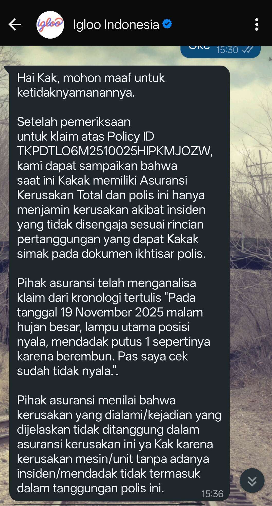 Saat saya menghubungi lewat WhatsApp, mereka menjelaskan bahwa polis tidak berlaku jika terjadi kelalaian user.