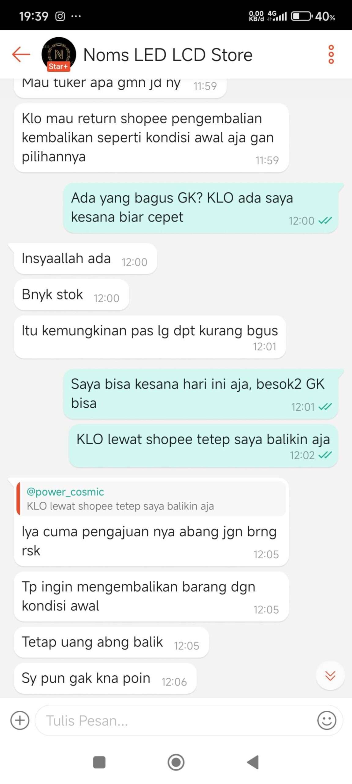 Saya juga menyampaikan di chat bahwa saya ingin melakukan penukaran langsung di lokasi penjual dan bersedia membatalkan komplain Shopee jika sudah mendapatkan penggantinya. Namun, penjual menolak dengan alasan sedang libur. Akhirnya, saya melanjutkan proses pengembalian barang, dan sebelum mengembalikannya, saya merekam video dari awal hingga selesai proses pengepakan paket return.
