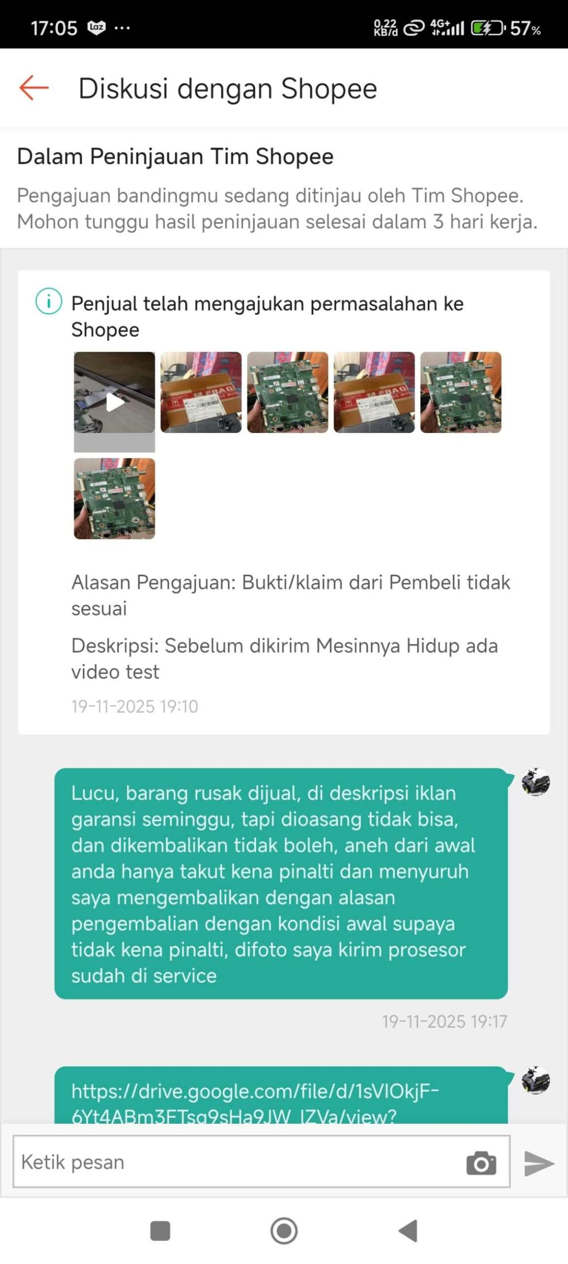 Saya berpikir ini terjadi karena sejak awal saya tidak memilih opsi pengembalian barang dengan kondisi awal agar penjual tidak terkena penalti, sehingga penjual mengajukan banding. Padahal, sebelum melakukan pemesanan, saya sudah menghubungi penjual untuk tidak mengirim barang yang rusak agar tidak terjadi retur, karena saya membutuhkan barang tersebut dengan cepat. Bahkan, di deskripsi iklannya disebutkan ada garansi satu minggu sejak barang diterima oleh pembeli. Namun, penjual justru mencari alasan untuk mengajukan banding hanya karena takut terkena penalti dari Shopee. Seharusnya, jika tidak ingin terkena penalti, penjual harus berdagang dengan jujur.