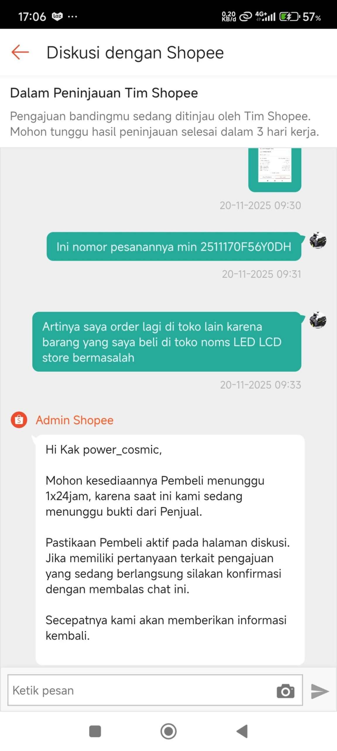 Banding dari penjual diajukan sejak tanggal 19 November 2025, dan keterangan dari tim Shopee menyatakan bahwa prosesnya akan selesai dalam tiga hari. Namun, kenyataannya pada tanggal 22 November 2025, admin Shopee meminta waktu 1×24 jam karena sedang menunggu bukti dari penjual.