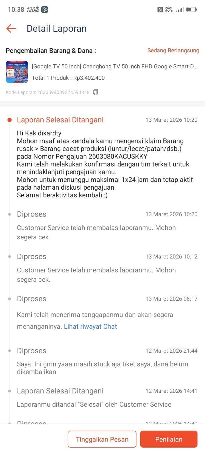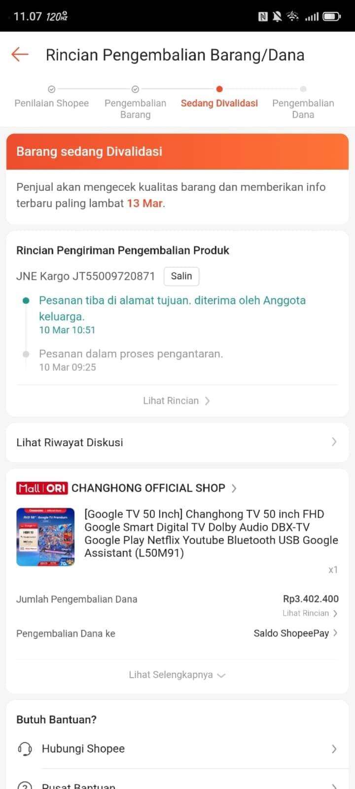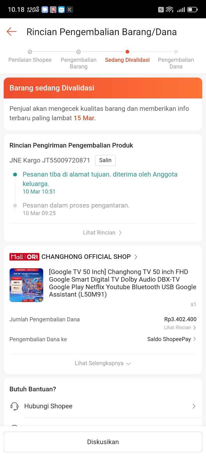 Saya ingin mengajukan keluhan mengenai proses pengembalian dana untuk pembelian produk TV melalui platform Shopee. Pada tanggal 7 Maret 2026, saya membeli TV Changhong 50 Inch dari toko Changhong Official Store di Shopee dengan harga Rp3.402.400. Barang tersebut saya terima pada 8 Maret 2026.