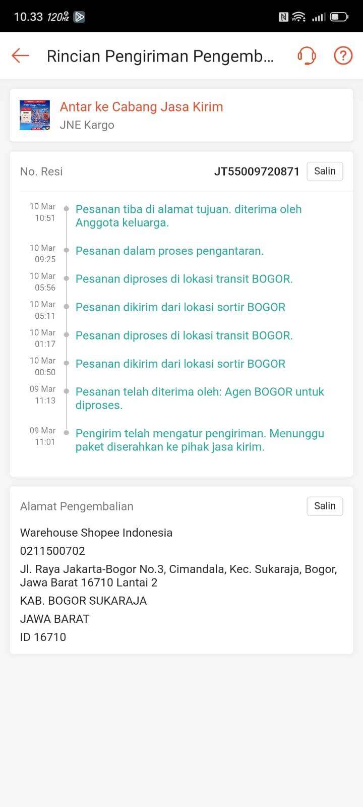 Pada 9 Maret 2026, saya mengirimkan kembali TV tersebut kepada penjual, dan menurut informasi pengiriman, barang tersebut telah diterima oleh penjual pada tanggal 10 Maret 2026.