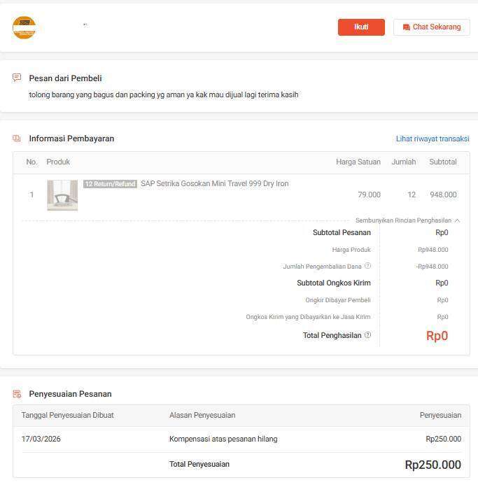 Saya adalah penjual di Shopee. Tanggal 24 Februari 2026, saya mengirim barang dengan nilai transaksi Rp948.000. Karena pesanan yang tak kunjung sampai, pembeli mengajukan pengembalian dana pada 6 Maret 2026, dan pengembalian tersebut disetujui Shopee pada 8 Maret 2026.