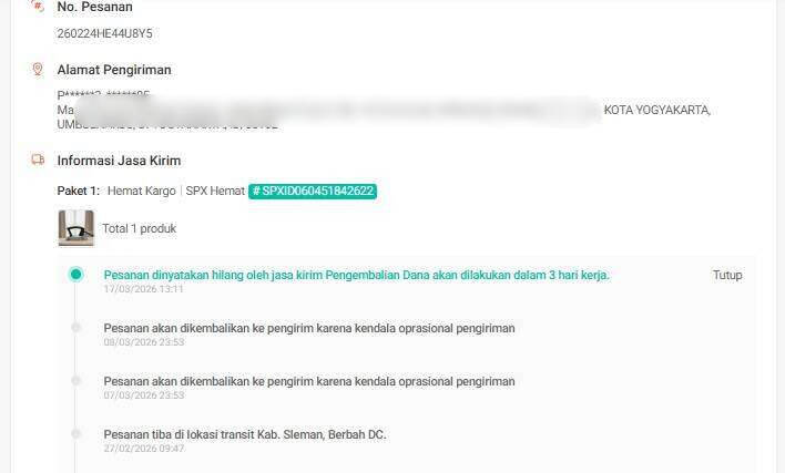 Barang saya dinyatakan akan dikembalikan ke alamat penjual dengan waktu pengiriman maksimal 14 hari, pada 21 Maret 2026. Karena barang tidak kunjung sampai, tanggal 16 Maret 2026 saya menanyakan status barang retur tersebut. Lalu barang saya dinyatakan hilang pada 17 Maret 2026.