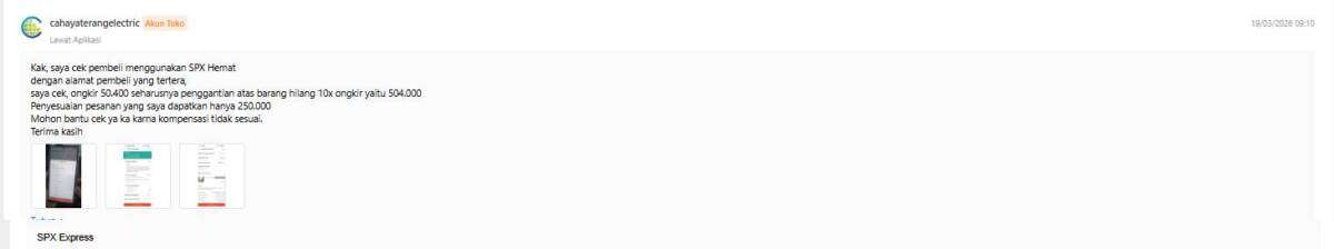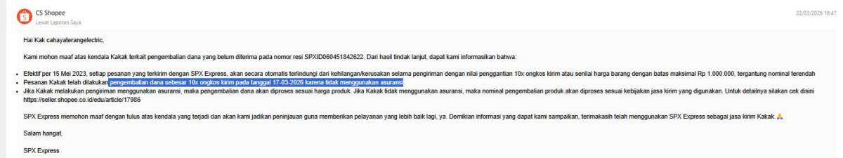 Saya sudah membuat laporan ke CS Shopee terkait perhitungan ongkos kirim yang tidak sesuai tersebut. Namun Shopee menyatakan sudah melakukan pengembalian dana sebesar 10x ongkos kirim pada tanggal 17-03-2026 karena tidak menggunakan asuransi.