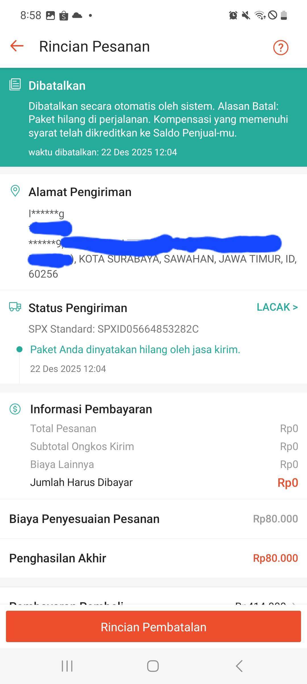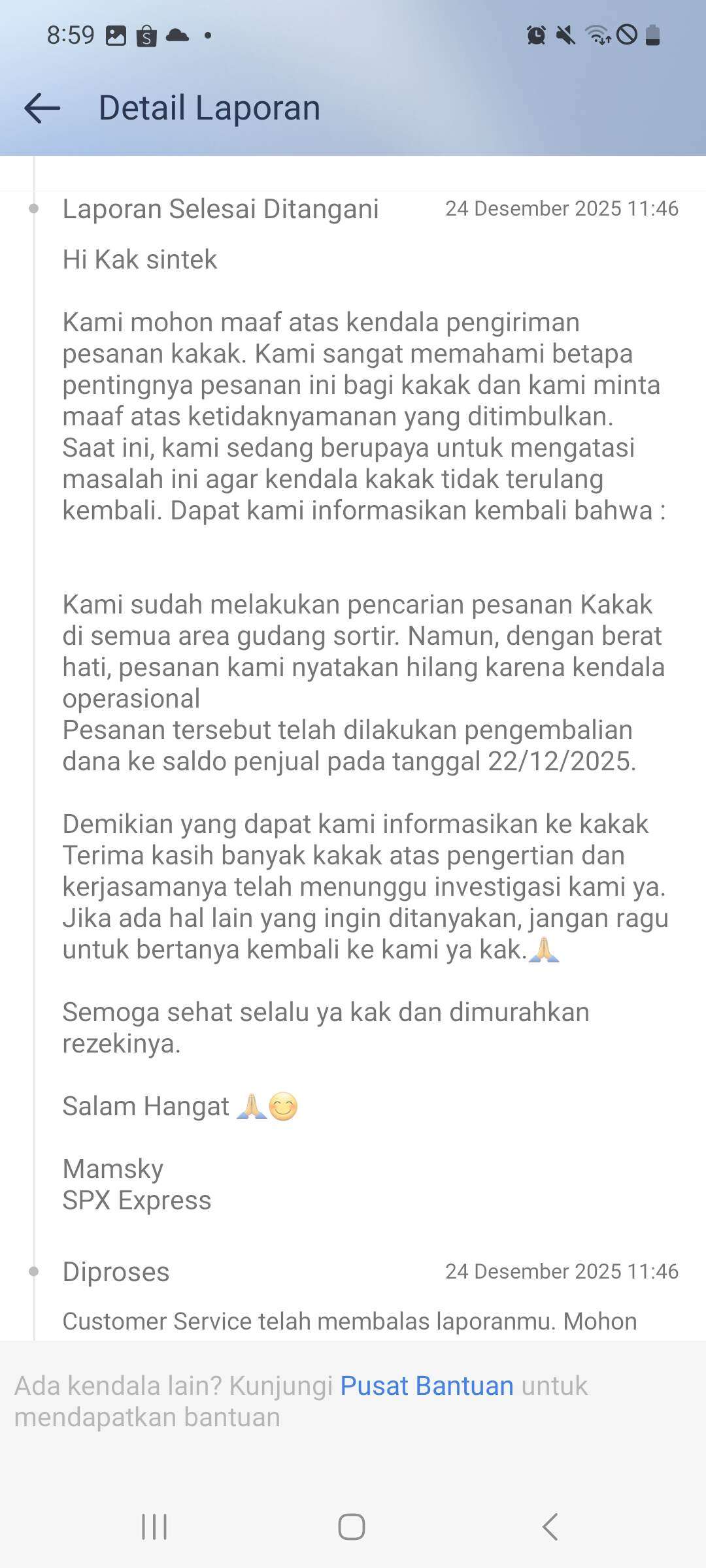 Perkenalkan, saya adalah penjual di Shopee yang mulai berjualan sejak tahun 2015. Pada bulan Desember 2025, saya mengirimkan pesanan pembeli di Shopee dengan tujuan Kota Surabaya, Jawa Timur. Tidak lama kemudian, saya mendapatkan notifikasi pemberitahuan bahwa paket tersebut dinyatakan hilang dan diberikan kompensasi penggantian barang hilang ke saldo penjual Shopee, serta status pesanan menjadi dibatalkan.