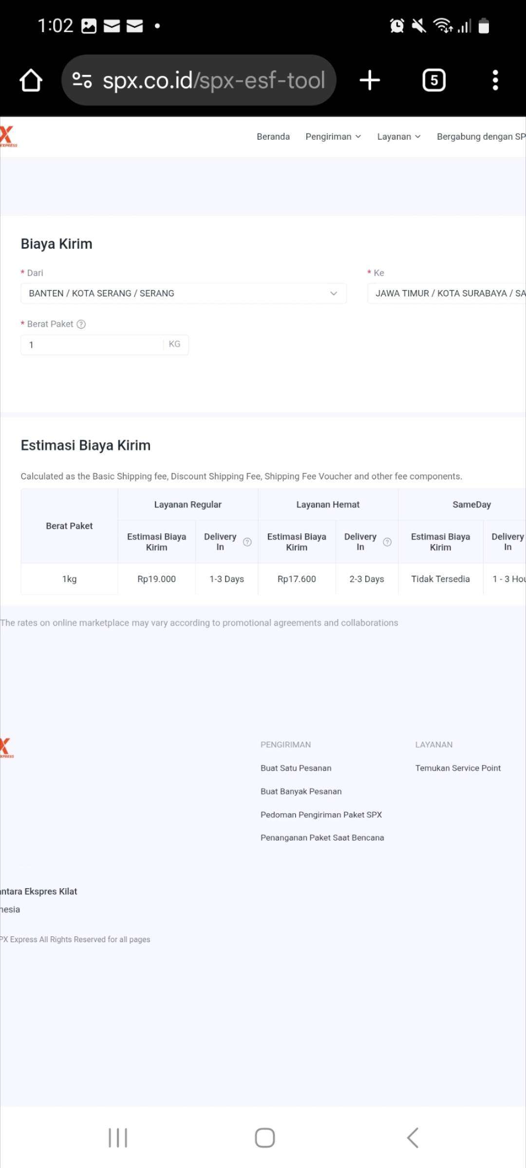 Saya kembali melakukan komplain, tetapi tetap tidak ada hasil. Berikut yang saya sesalkan dan tidak habis pikir, mengapa hanya dihitung Rp80.000, sedangkan harga barang saja mencapai Rp414.000. Saya kemudian mengecek situs web resmi SPX dan mendapati bahwa ongkos kirim dari Kota Serang, Banten ke Kota Surabaya, Jawa Timur adalah Rp19.000 per kilogram.