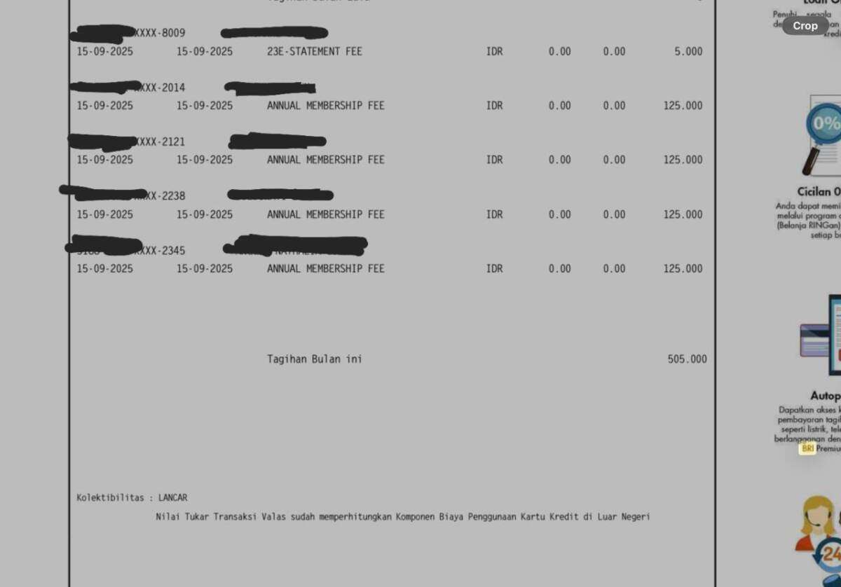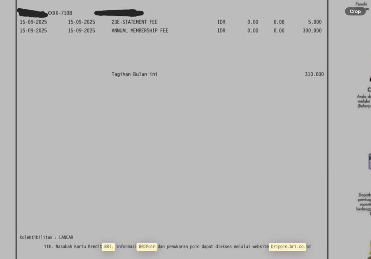 Syarat yang diajukan untuk penghapusan iuran tahunan sangat terbatas, seperti: tagihan IndiHome, tagihan Halo, Matrix, dan PLN. Padahal, layanan tersebut sudah saya gunakan di kartu kredit BRI saya. Saya meminta syarat lain seperti pemakaian, tetapi dijawab tidak ada.