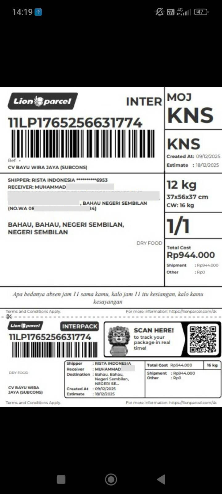Pada tanggal 9 Desember 2025, saya mengirimkan paket dari Mojokerto, Indonesia, dengan tujuan Negeri Sembilan Bahau, Malaysia, dengan nomor resi 11LP1765256631774. Namun, sejak awal proses pengiriman, saya sudah mengalami pengalaman yang tidak menyenangkan.