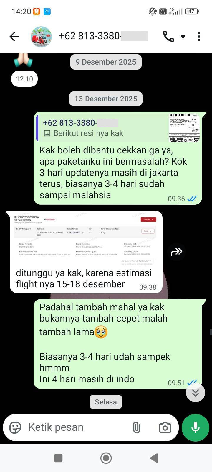 Saya menunggu sesuai estimasi kedatangan, yaitu tanggal 15–18 Desember 2025, tetapi status paket tetap berhenti di Jakarta. Pada tanggal 18 Desember, saya menghubungi call center dan diminta menunggu dua hari kerja. Namun hingga tanggal 19 Desember, tidak ada informasi atau tindak lanjut, sehingga saya kembali menghubungi call center. Saat itu saya mendapat informasi bahwa paket saya sebenarnya sudah berada di Kuala Lumpur sejak tanggal 11 Desember 2025, tetapi masih menunggu konfirmasi dari vendor di Malaysia.