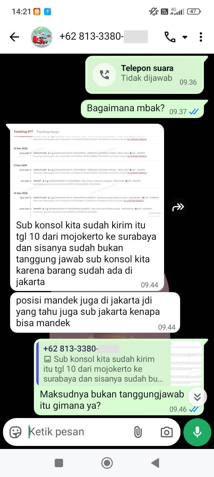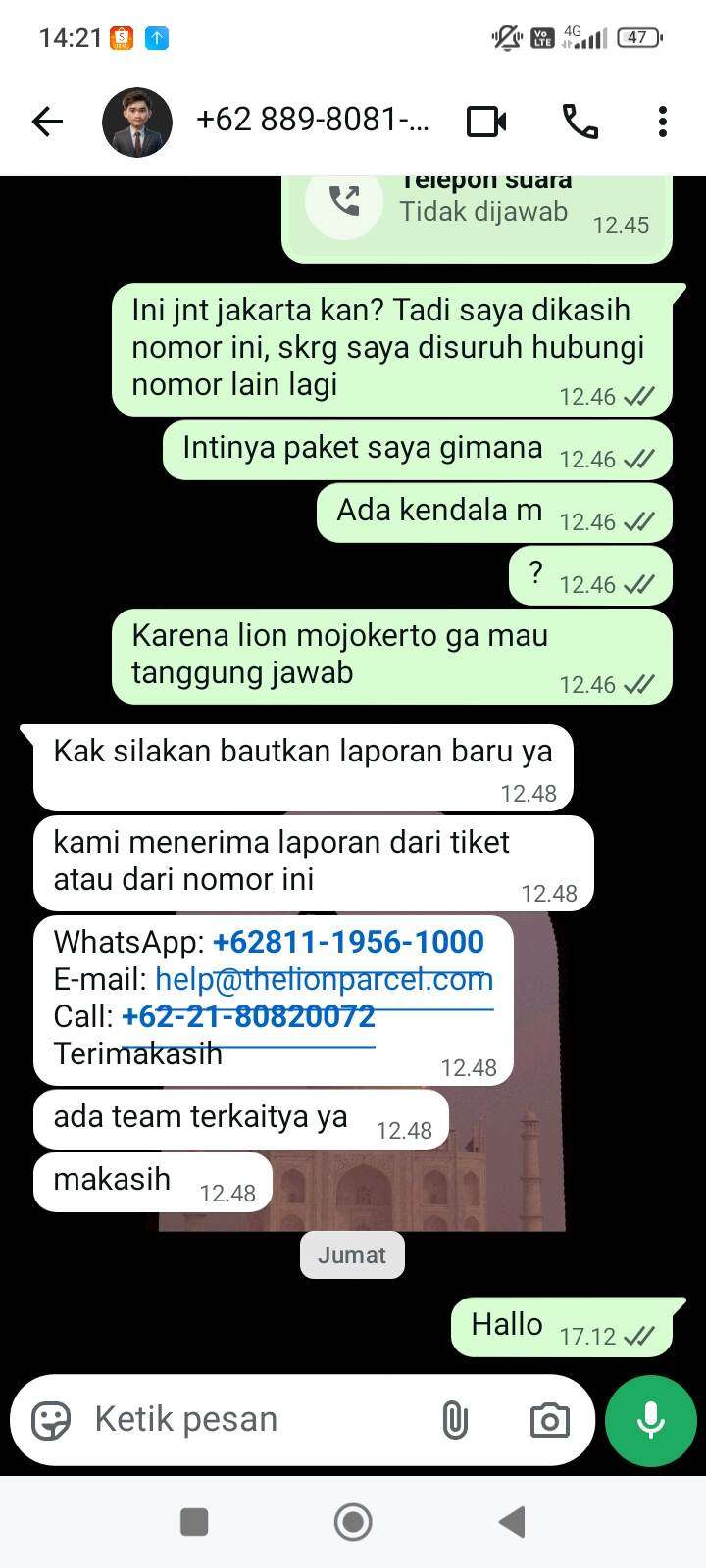 Saya mengajukan komplain ke pihak Lion Parcel Mojokerto, tetapi mereka menyatakan tidak bertanggung jawab karena paket sudah dikirim ke Jakarta. Saya kemudian menghubungi Lion Parcel Jakarta, namun justru diarahkan untuk menghubungi call center.