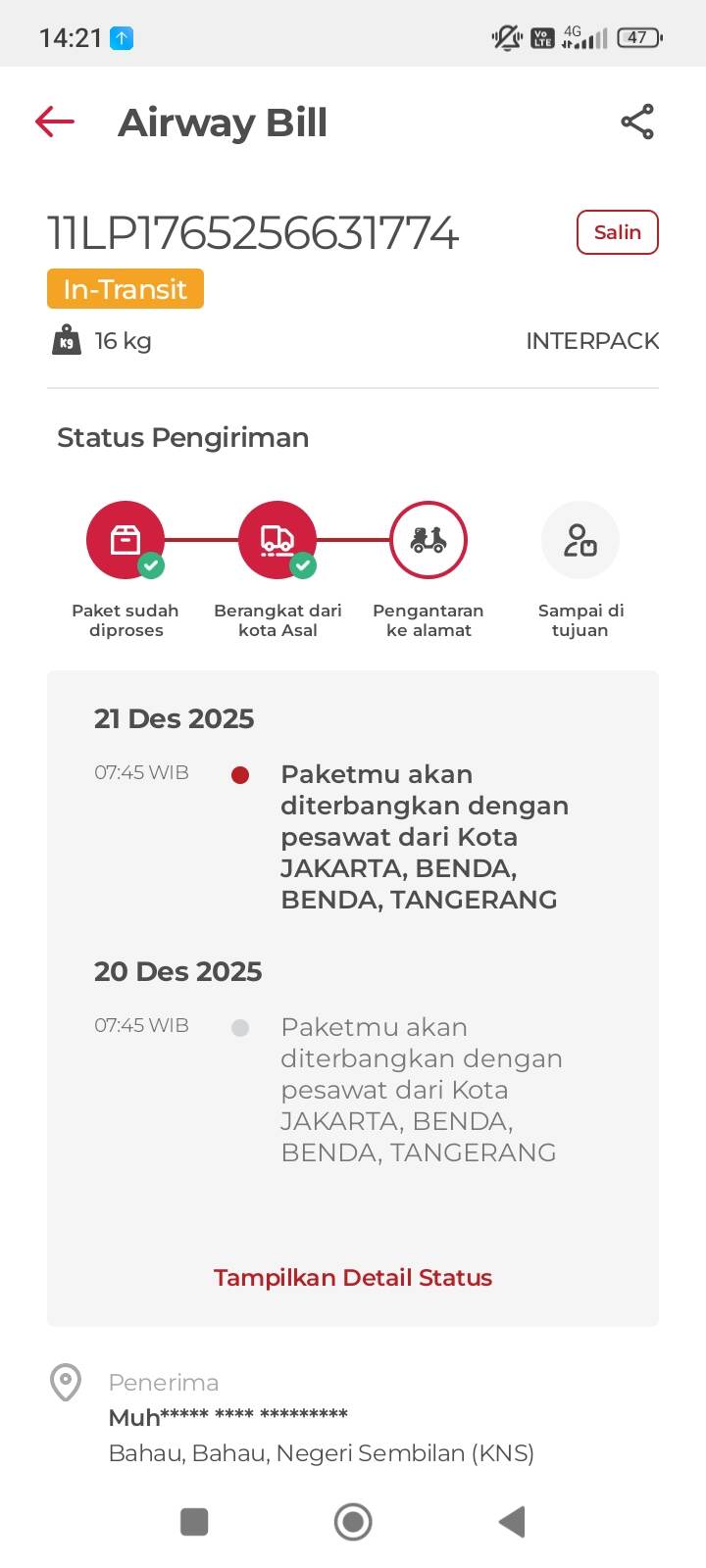 Pada tanggal 21 Desember 2025, saya kembali menghubungi call center. Saat itu disampaikan bahwa paket saya memang sudah berada di Bandara Kuala Lumpur sejak tanggal 11 Desember 2025, namun tertahan di pihak Bea Cukai. Informasi ini bertentangan dengan keterangan sebelumnya pada tanggal 20 Desember 2025, di mana pihak Lion Parcel bahkan menyatakan tidak mengetahui apakah paket saya hilang atau tidak.
