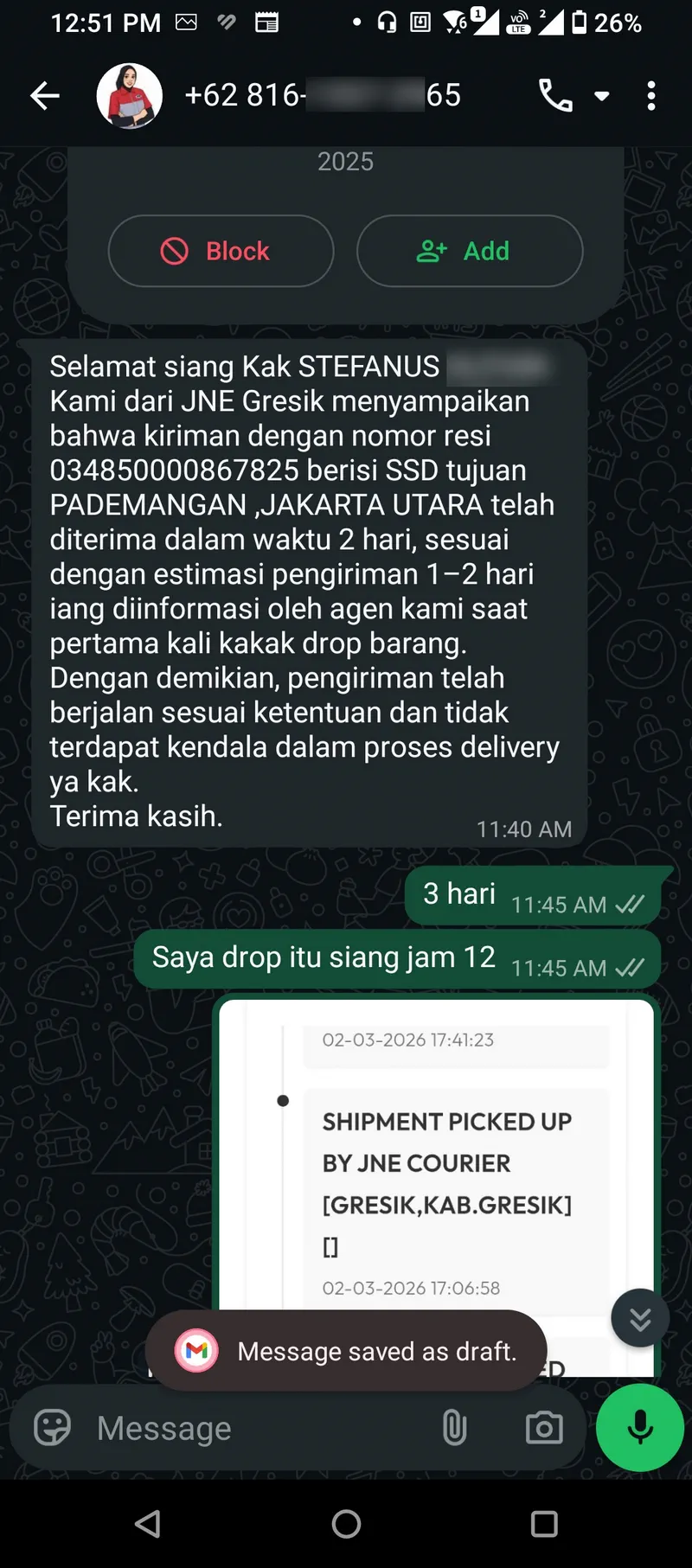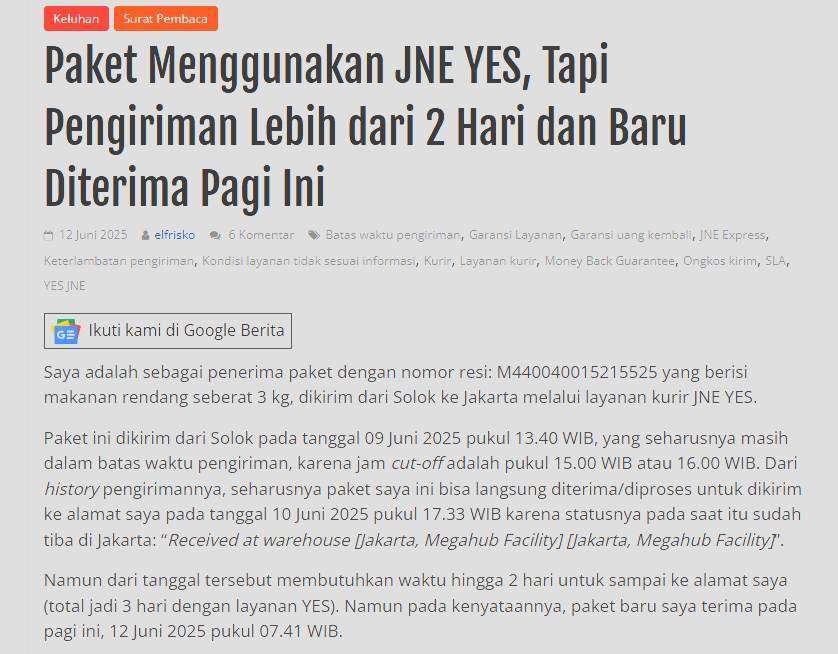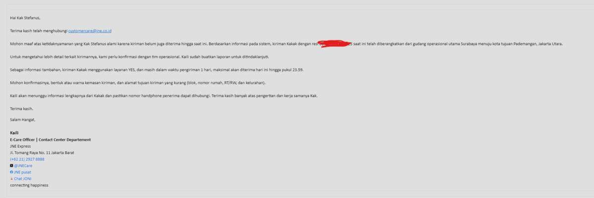 Adapun alasan saya baru memposting sekarang adalah karena saya masih menunggu respons dari pihak JNE, dan karena tidak ada respons yang datang, baru saya angkat ke sini.