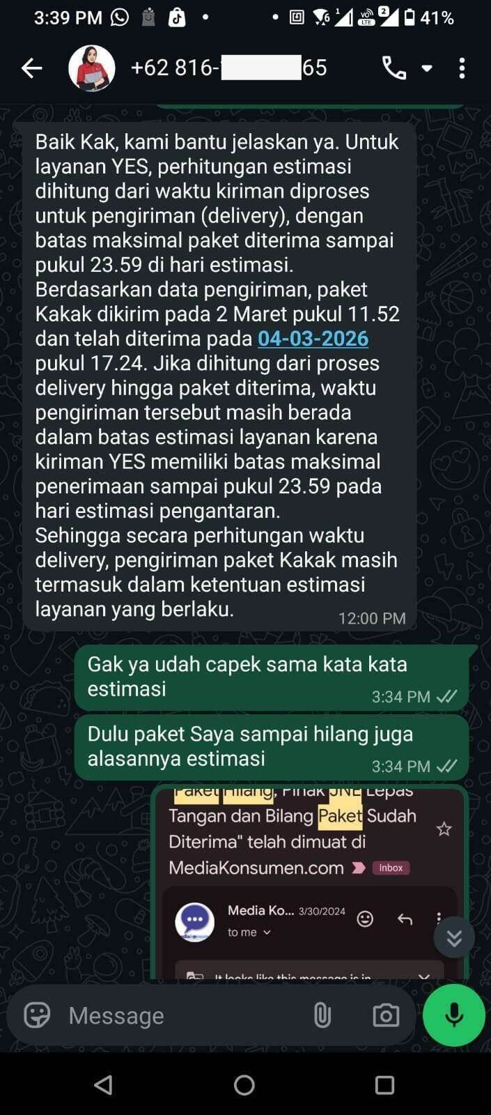Yang lebih mengherankan, ada pengguna JNE YES lain yang pengirimannya justru lebih cepat dari punya saya, meskipun sama-sama melebihi estimasi.