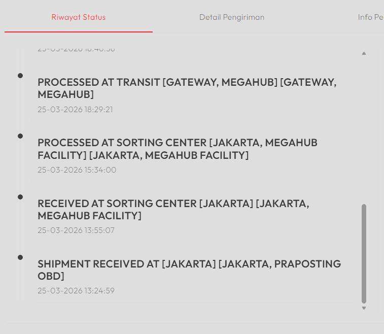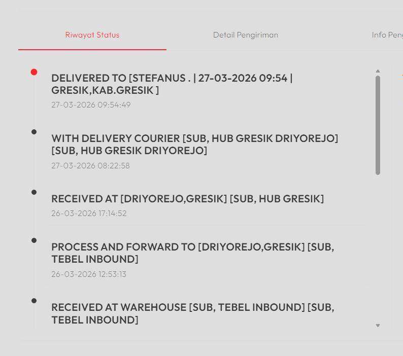 Pada tanggal 2 Maret 2026 pukul 11.50, saya menggunakan layanan JNE YES dari Gresik (perbatasan Gresik dan Surabaya) ke Jakarta. Namun sejak barang di-drop hingga keesokan harinya, posisi barang masih di Surabaya. Nomor resi JNE: 034850000867825.