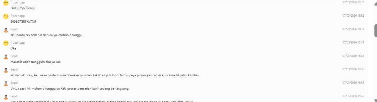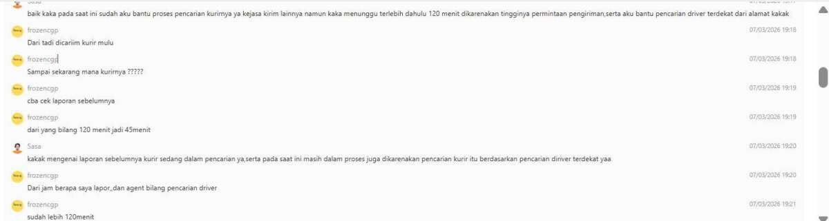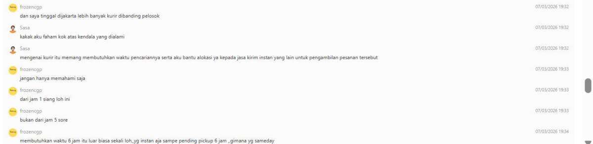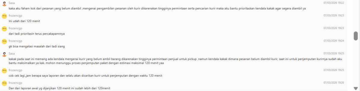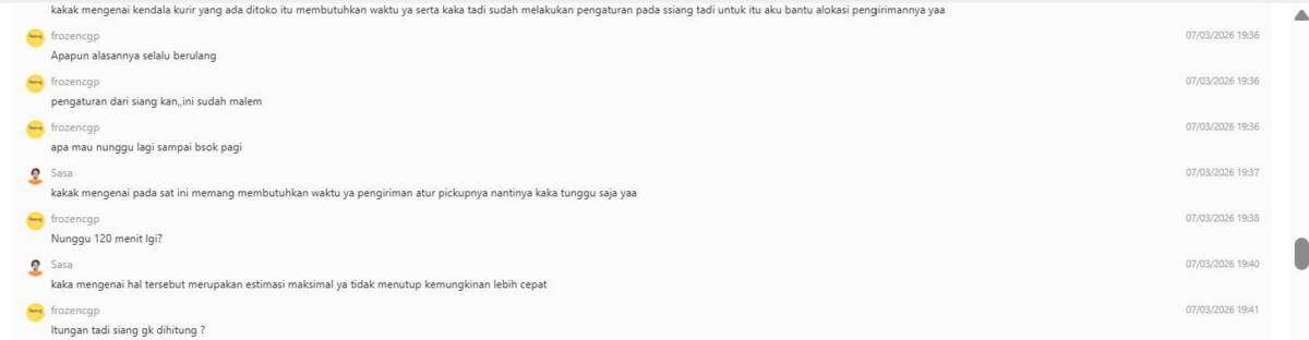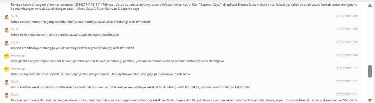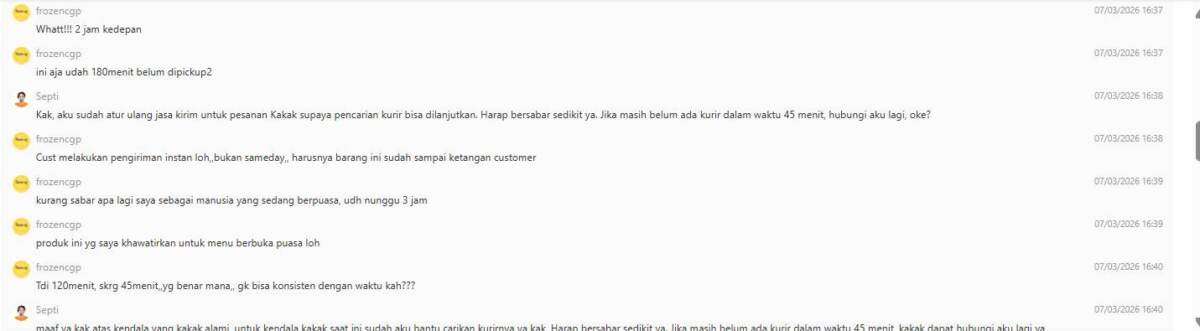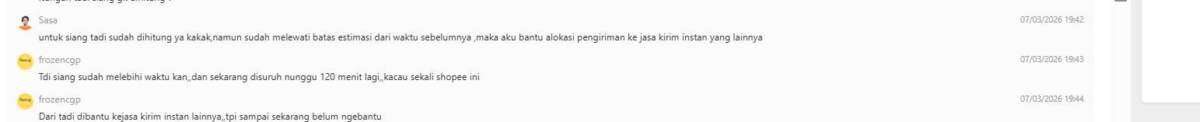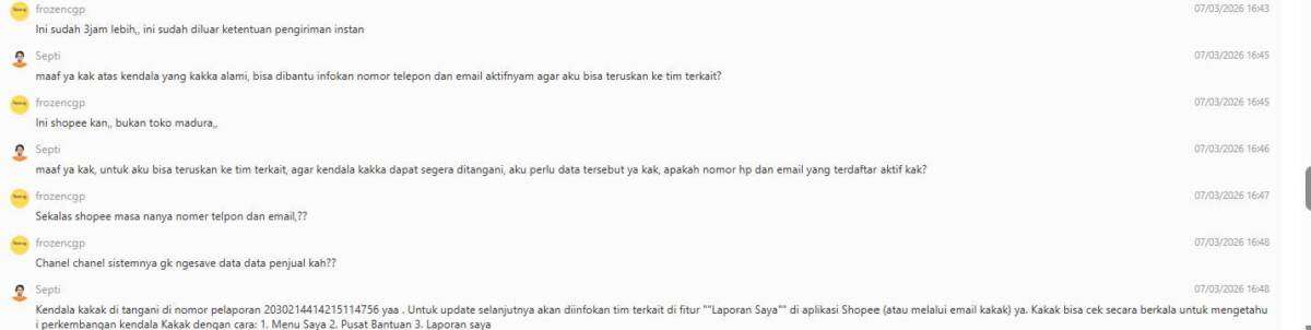 Posisi saya sebagai penjual memikirkan pelanggan saya yang seharusnya dengan layanan instan sudah tiba dengan cepat, tetapi sampai detik ini belum tiba. Produk saya adalah frozen food, di mana kemungkinan produk tersebut untuk berbuka puasa. Namun pihak Shopee terkesan abai dengan semua laporan yang sudah saya buat sebanyak 3 kali, seperti acuh dan tidak peduli. Percakapan dan jawaban yang selalu sama tanpa solusi sampai saat ini.