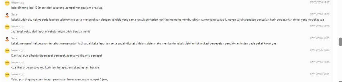 Selamat malam, saya ingin melaporkan perihal tidak ada tindak lanjut kendala pengiriman instan melalui Shopee. Saya melakukan request kurir pada tanggal 7 Maret 2026 pukul 13.01 WIB. Sampai saat ini pukul 21.31 WIB belum ada kurir yang pickup, padahal pengiriman menggunakan kurir instan yang seharusnya tidak melebihi 2 jam.