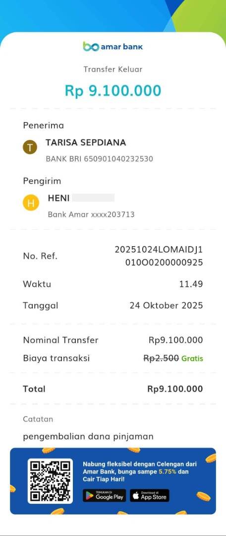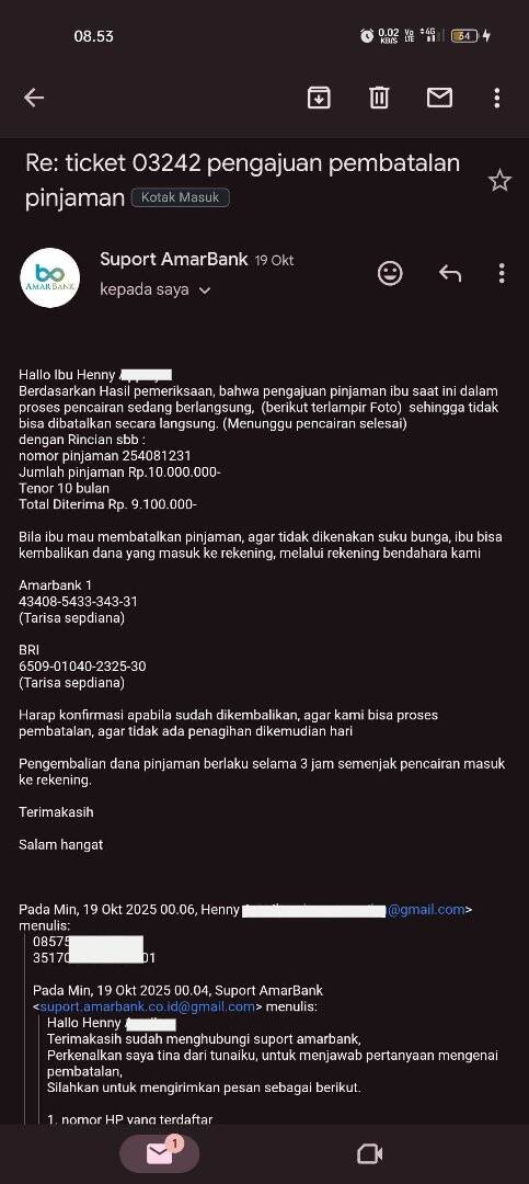 Saya disarankan untuk mengajukan ulang, dan setelah dana pinjaman cair, saya mengembalikannya kepada bendahara Tunaiku sesuai arahan dari orang tersebut. Saya transfer dana Rp9.100.000 ke nomor rekening BRI: 650901040232530 atas nama Tarisa Sepdiana. Setelah itu, dia meminta saya untuk menunggu 3×24 jam untuk proses pembatalan.