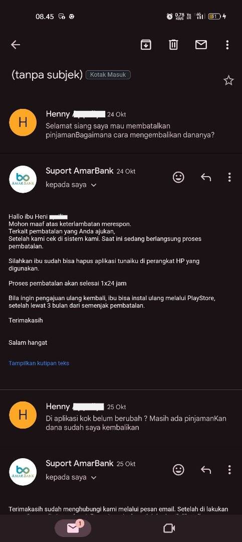 Saya juga menerima email dari Tunaiku (email penipuan -redaksi) yang menyatakan bahwa proses pengembalian dana atau pembatalan pinjaman sedang dilakukan dalam waktu 3×24 jam dan saya diminta untuk menghapus aplikasi Tunaiku. Saya pun menghapus aplikasi tersebut karena sudah tidak ada tanggungan atau pinjaman.