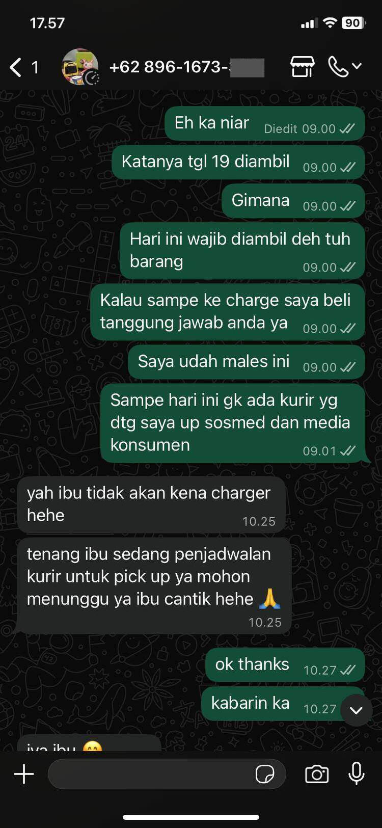 Oleh karena itu, saya meminta agar barangnya diambil kembali satu hari setelah saya menerimanya (H+1). Saya dijanjikan penjemputan pada tanggal 19 Oktober, kemudian mundur ke tanggal 22–24 Oktober. Namun hingga tanggal 25 Oktober, barang tersebut tidak diambil sama sekali!