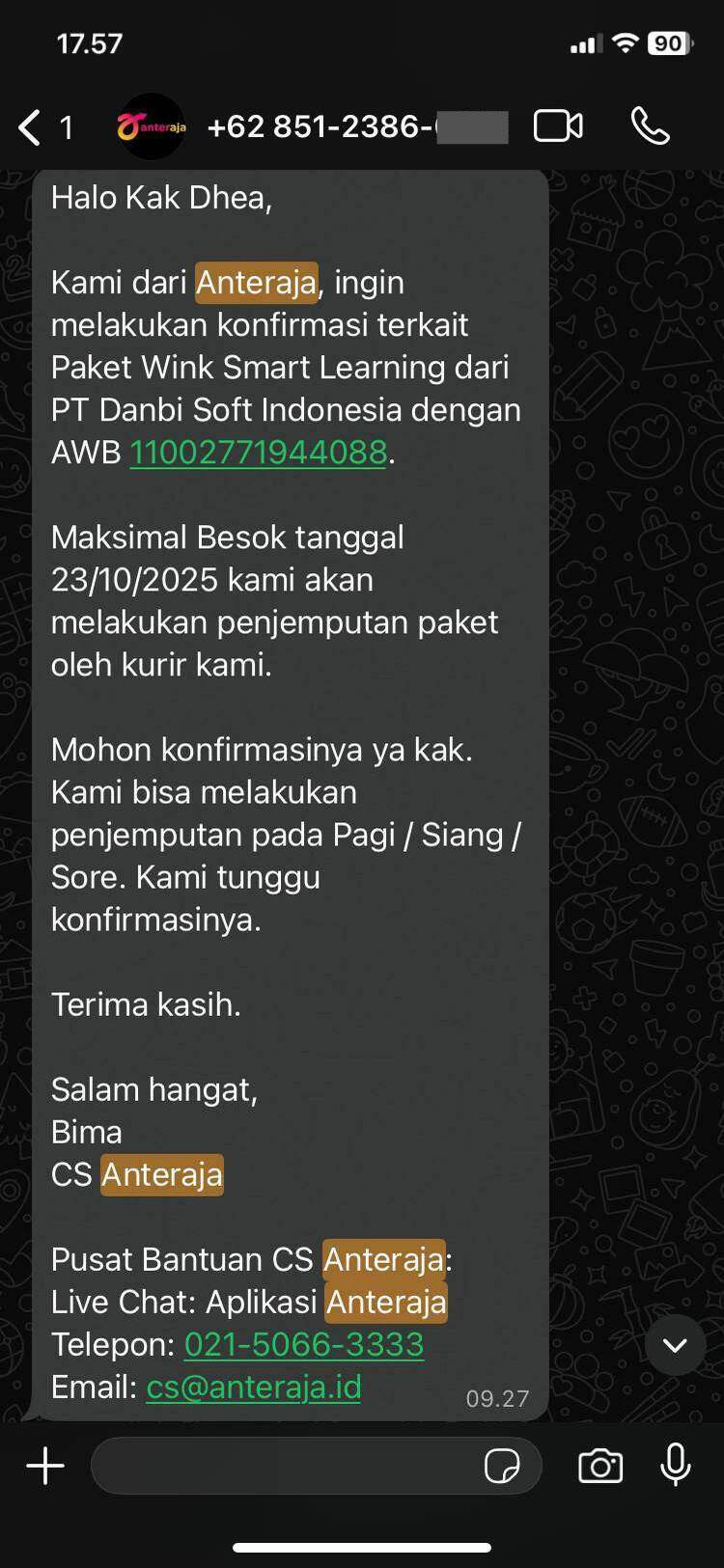 Logistik Anteraja hanya aktif melalui chat WhatsApp, tetapi bukti penjemputan tidak ada sama sekali. Jujur, saya sangat kecewa. Saya tidak ingin dikenai charge apa pun untuk produk yang tidak saya butuhkan saat ini.