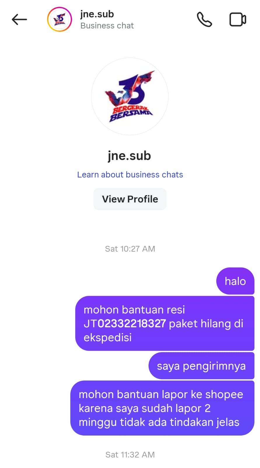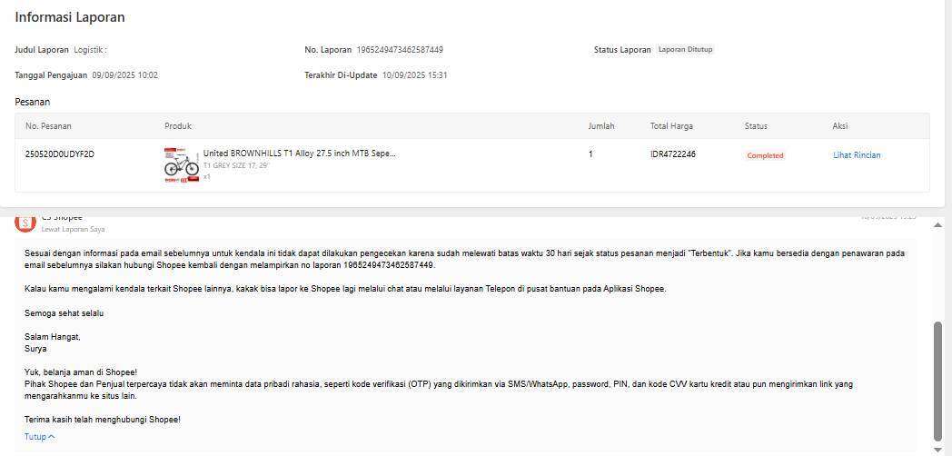 - Saya telah menghubungi Shopee melalui menu Seller Centre → Hubungi CS → Barang Hilang, dan juga melapor ke JNE pusat. Namun, hingga kini, saya belum mendapatkan jawaban yang memuaskan dengan nomor laporan Shopee: 1982289968131661914.