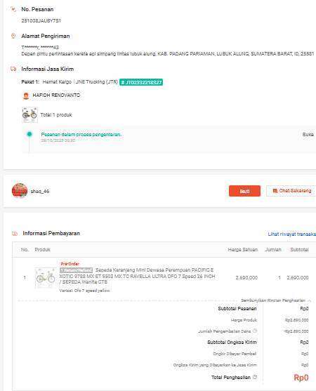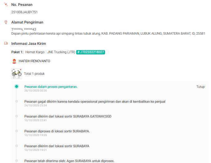 - Status pelacakan menunjukkan bahwa paket tidak diterima oleh pembeli dan paket dikembalikan kepada penjual. Namun, hingga tanggal 05 November 2025, saya belum menerima paket tersebut dan tidak ada notifikasi apapun dari JNE maupun Shopee mengenai barang yang hilang ini. Padahal barang tersebut termasuk dalam kategori besar, panjang, dan berat (unit sepeda CTB dalam kardus).