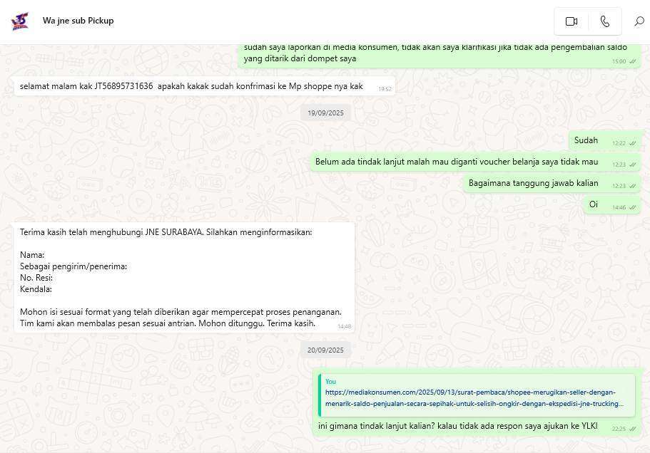 - Saya juga telah mengajukan keluhan ke WhatsApp CS JNE Surabaya di nomor +62 851-7972-3639, tetapi tidak ada tanggapan dan mereka hanya menyarankan untuk menghubungi Shopee.