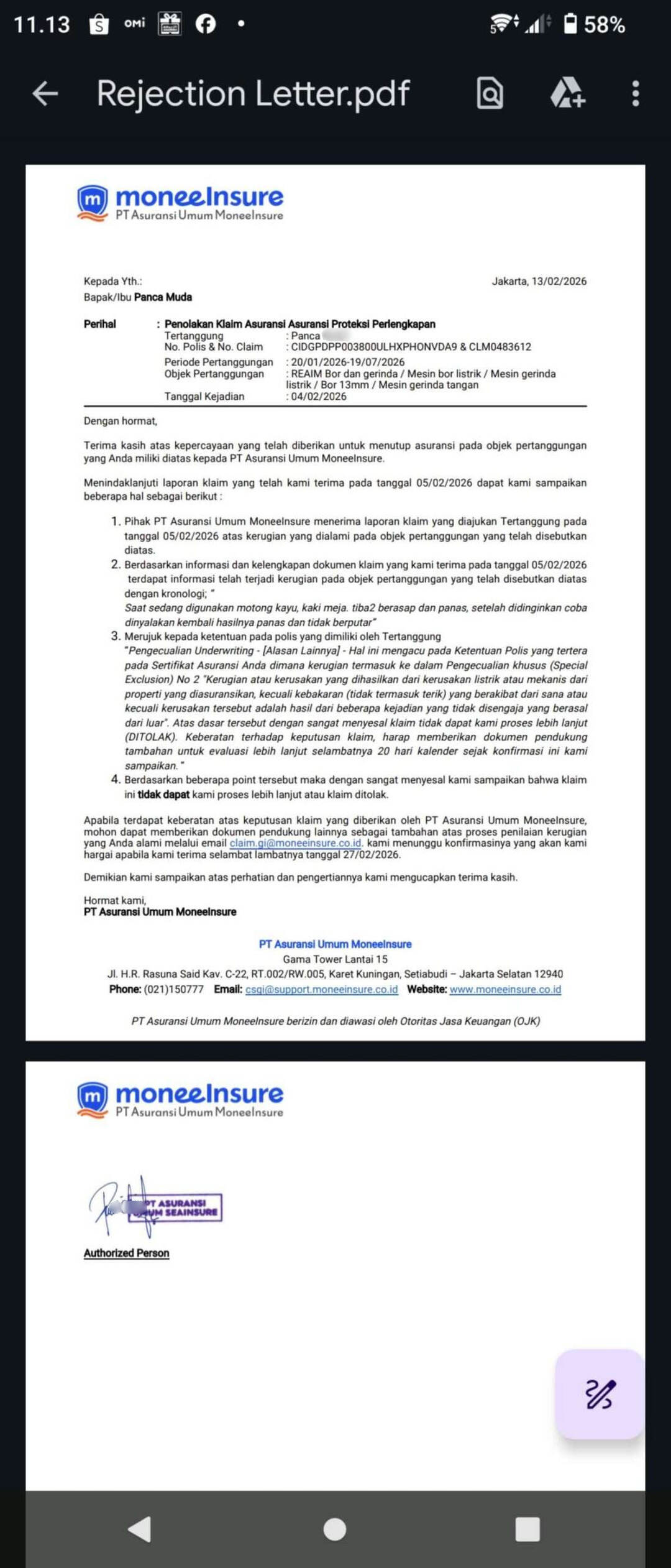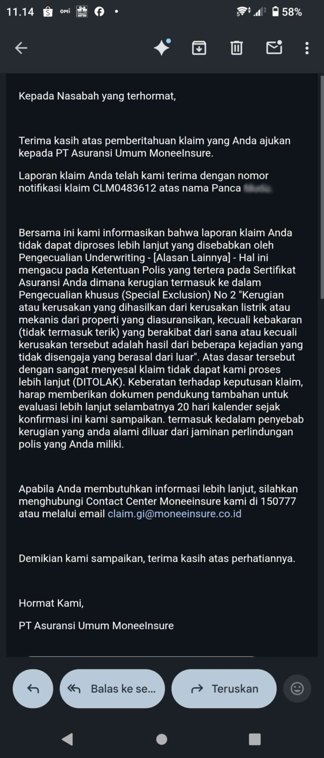 Penolakan Klaim Asuransi Proteksi Kerusakan+ oleh MoneeInsure di Shopee