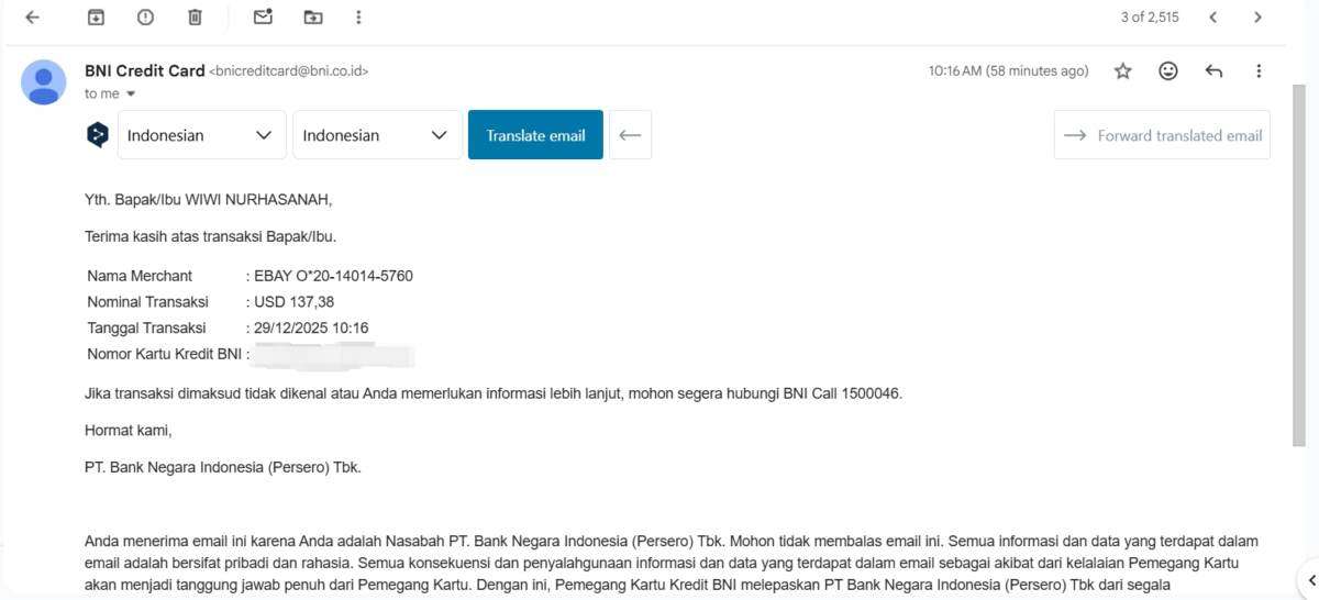 Selanjutnya, pada tanggal 29 Desember 2025, saya menerima notifikasi melalui email atas transaksi kartu kredit BNI saya di merchant eBay senilai USD 137,38. Transaksi tersebut juga bukan saya yang melakukannya.
