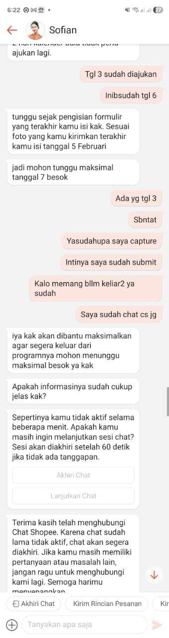 Pada 6 Februari 2026, status tersebut belum diproses. Saya menghubungi customer service Shopee untuk meminta penjelasan. Saat itu saya diminta menunggu dua hari kerja, yaitu sampai tanggal 7 Februari 2026.