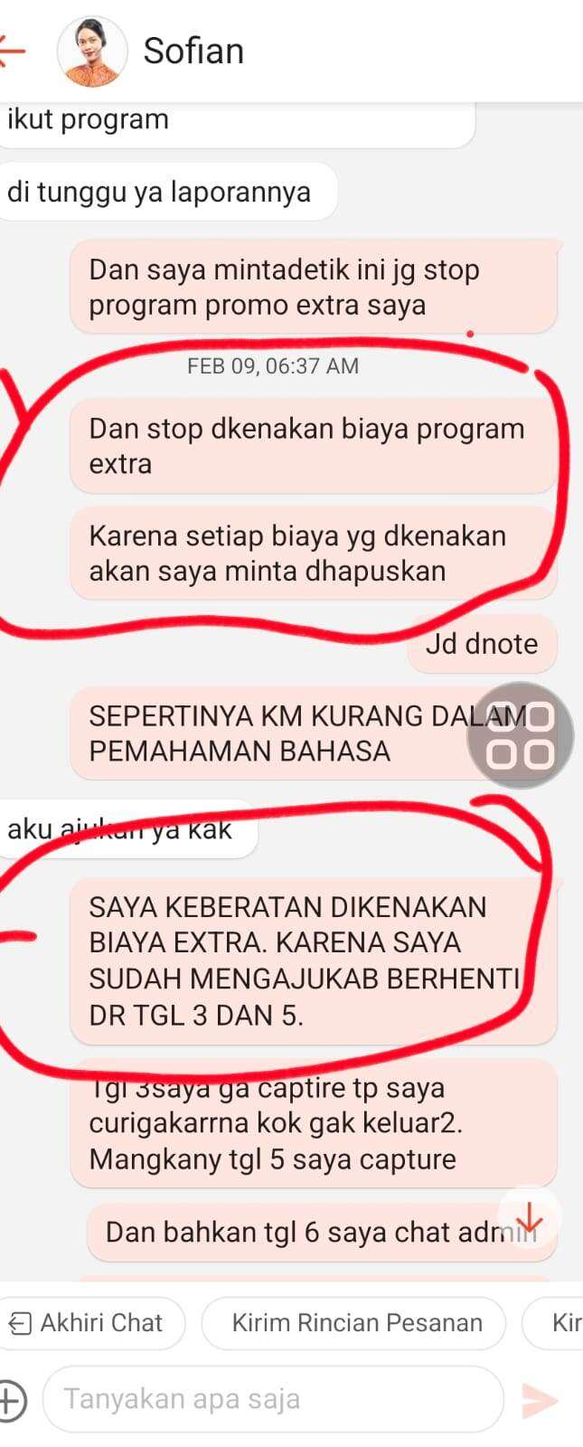 Saat saya kembali menyampaikan keberatan dan ingin meminta pengembalian, jawaban dari customer service sangat tidak memuaskan dan terkesan menghindari substansi masalah, “aku bantu cek saat ini sudah tidak bergabung dengan promo extra, terkait pengembalian dana tidak dapat dilakukan karena penjual mendapatkan benefit program promo xtra”.