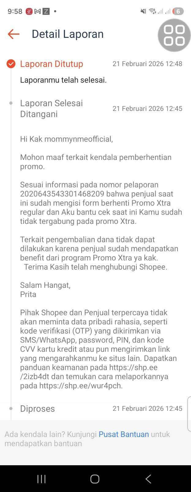 Melalui keluhan ini, saya juga mempertanyakan secara terbuka: apakah memang seperti ini sistem yang diterapkan Shopee, di mana seller yang tidak menyadari perubahan status promo akhirnya harus menanggung biaya tambahan dari promo yang tidak pernah didaftarkan?