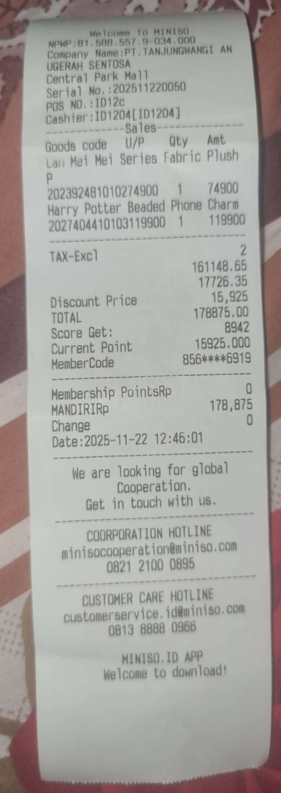 - Jadi mohon pihak Miniso CP bisa menjelaskan dari mana asal-muasal angka per barang di nota yang berbeda dengan harga di etalase, dan jumlah akhirnya yang seperti tidak terhubung satu sama lain dengan angka di atasnya.
