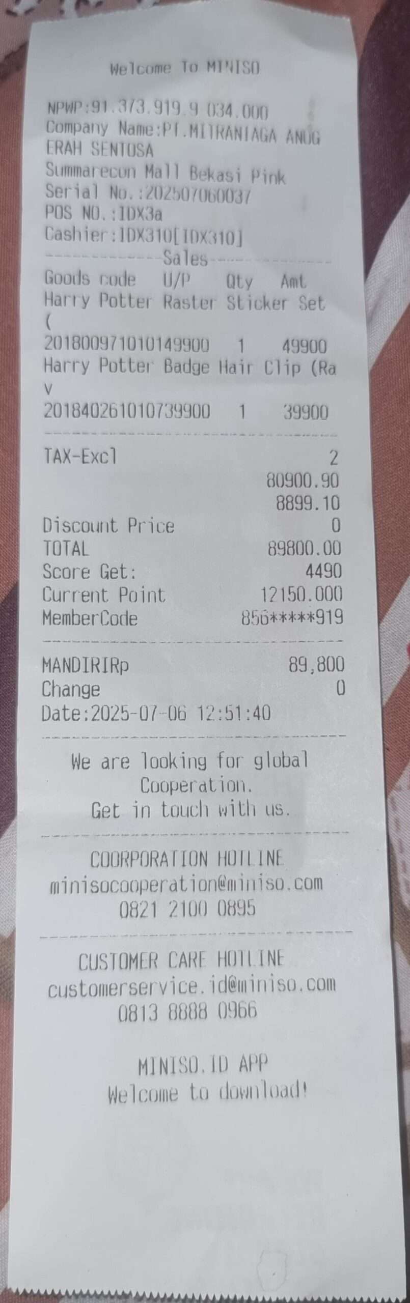 Sebagai tambahan informasi, saya juga pernah belanja di Miniso Summarecon Mall Bekasi (Miniso SMB), dan harga yang dibayarkan konsumen dengan angka-angka yang tercantum di nota itu bisa dirunut hasil akhir angkanya. Dan harga di nota juga sesuai dengan harga di etalase. Berikut foto nota belanja di Miniso SMB:
