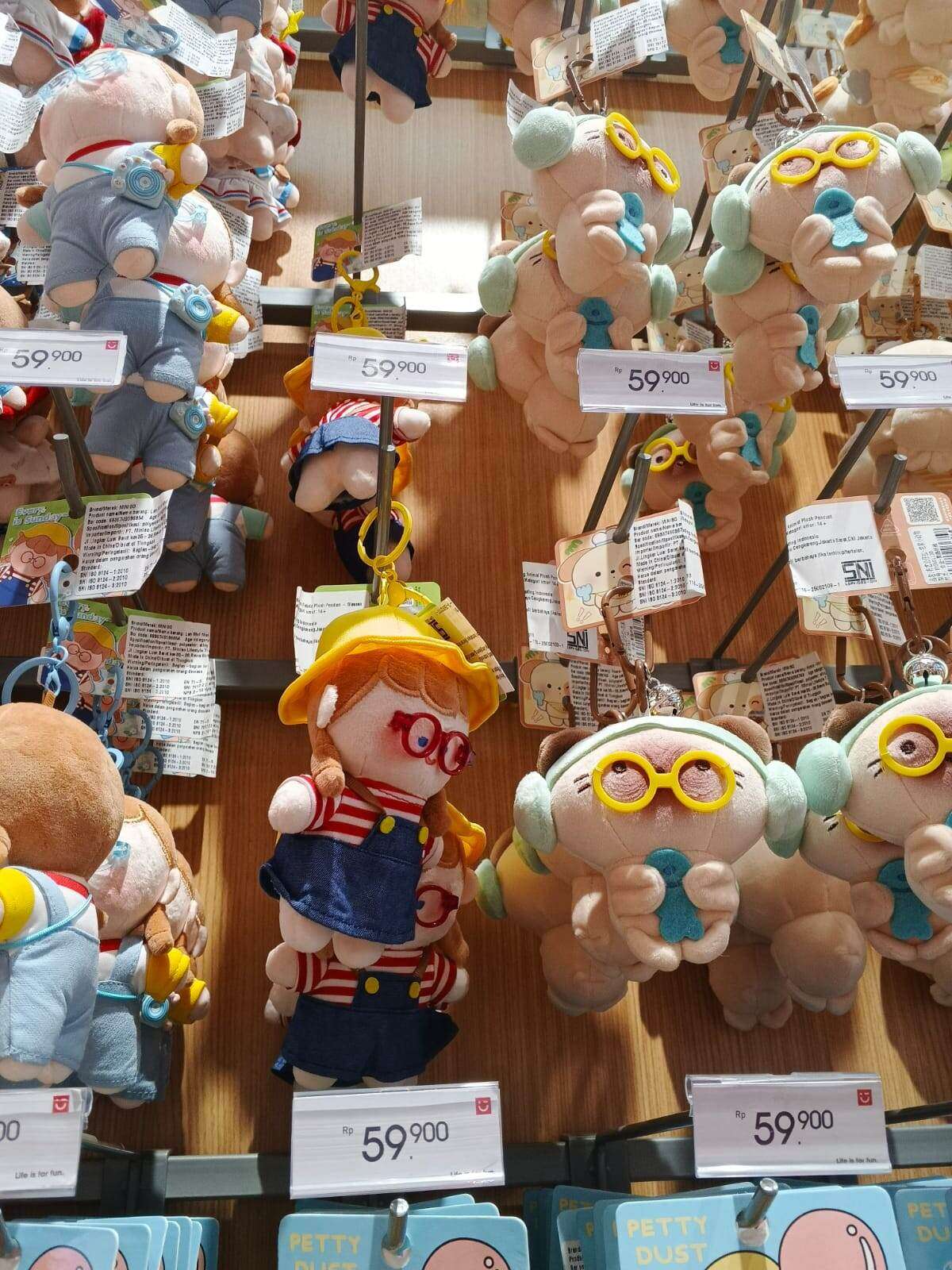 Pada etalase, untuk produk gantungan kunci plushy tertera 59.900 dan untuk phone strap tertera 99.900. Kebetulan saya waktu itu tidak mengambil foto harga saat di etalasenya.